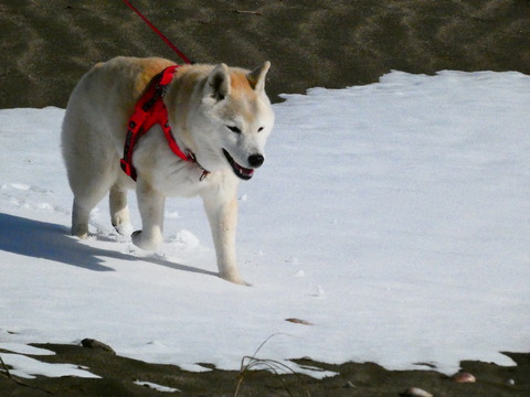 ヒャッホ~ ⛄砂浜にも少しだけ雪が積もりましたよ~。ゼブラの模様みたいだね~ ? ? ?・・・